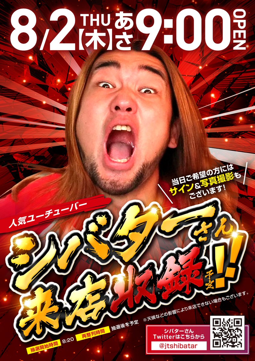今月もやってまいりましたシバター来店ツアー!夏真っ盛りの8月の1店舗目はクラブイーグル千歳店!湿度の低い爽やかな北海道の夏の日に熱気あふれるシバター来店!抽選並びは350人オーバー!さあ、今日もはじまり魔ーす!#シバター #イーグル pic.twitter.com/ZwnGDuorni