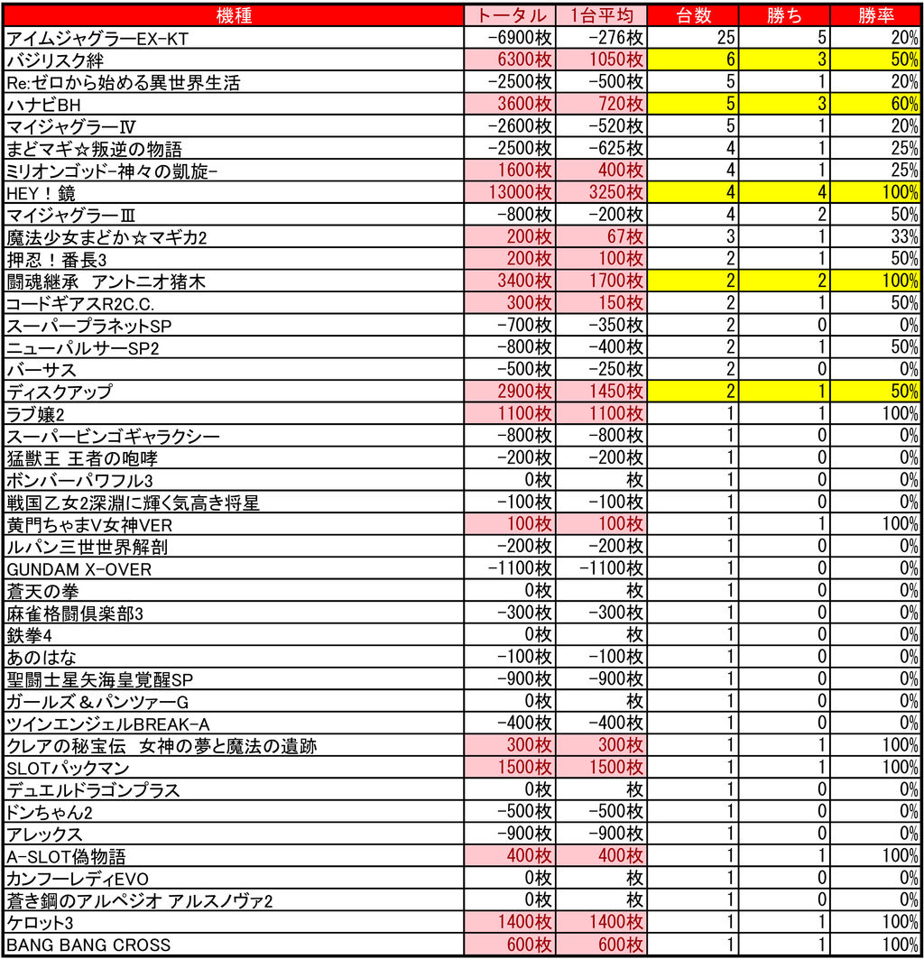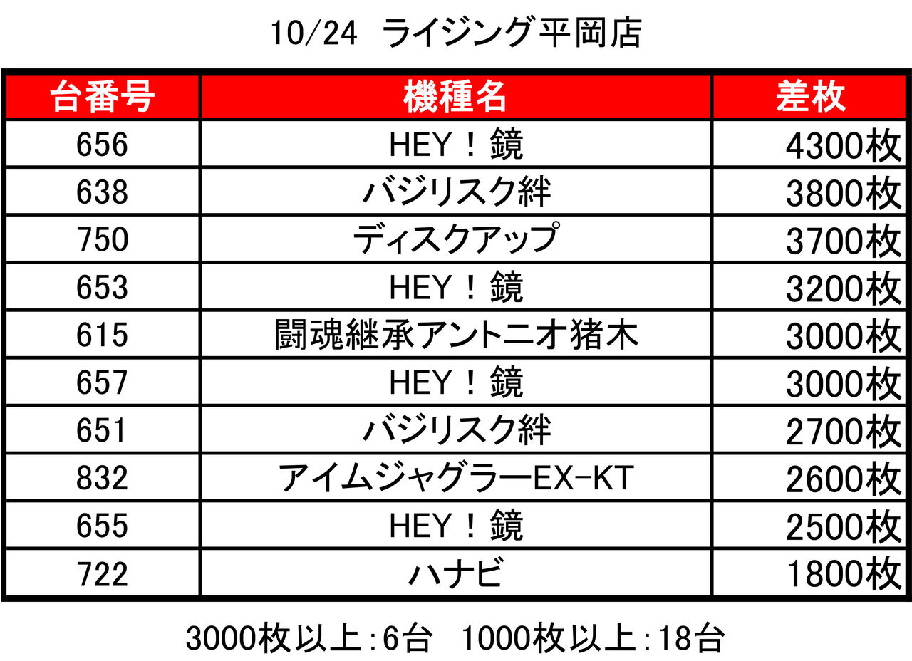 2019年10月25日 【10/24ライジング平岡店】時差10:00オープン→集計結果 急にこの時期に時差オープン?いったい結果はどーなったのか?気になったので集計してみました。集計結果全体差枚:+14100枚1台平均:+135枚(20スロ:104台)ほうほうほう。なんだか上記のあたりが調子良かったようですね・・・ww全体勝率→35/104で34パーでしたー。 「時差開店」カテゴリの最新記事