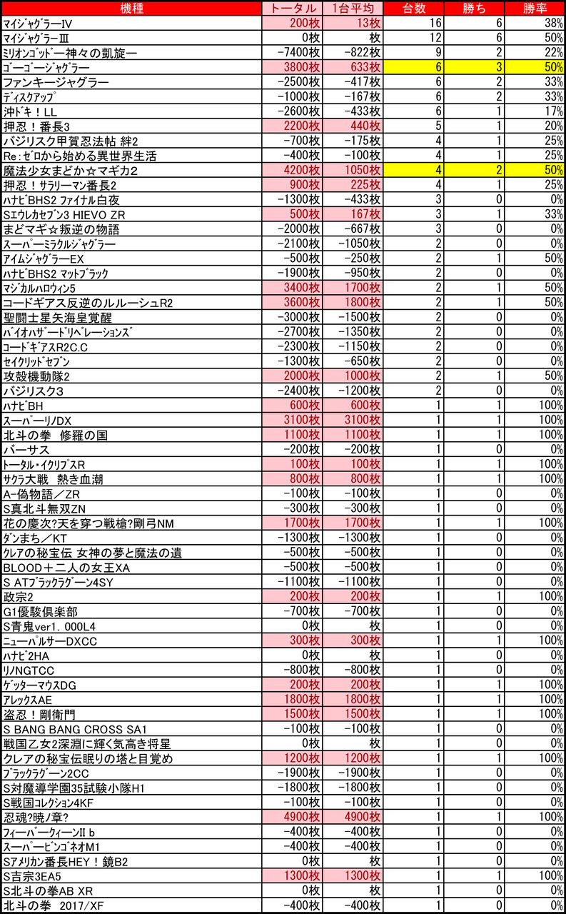 2020年11月01日 【10/31アーリーバード藻岩店】1の付く日→集計結果 1の付く日はアーリーバード藻岩店!ということで集計していきたいと思います。↓ちなみに前回↓【10/1アーリーバード藻岩店】1の付く日→集計結果では、早速。集計結果全体差枚:-5100枚1台平均:-34枚(20スロ:148台)全台勝率→47/148で32パーでした。 「特日」カテゴリの最新記事