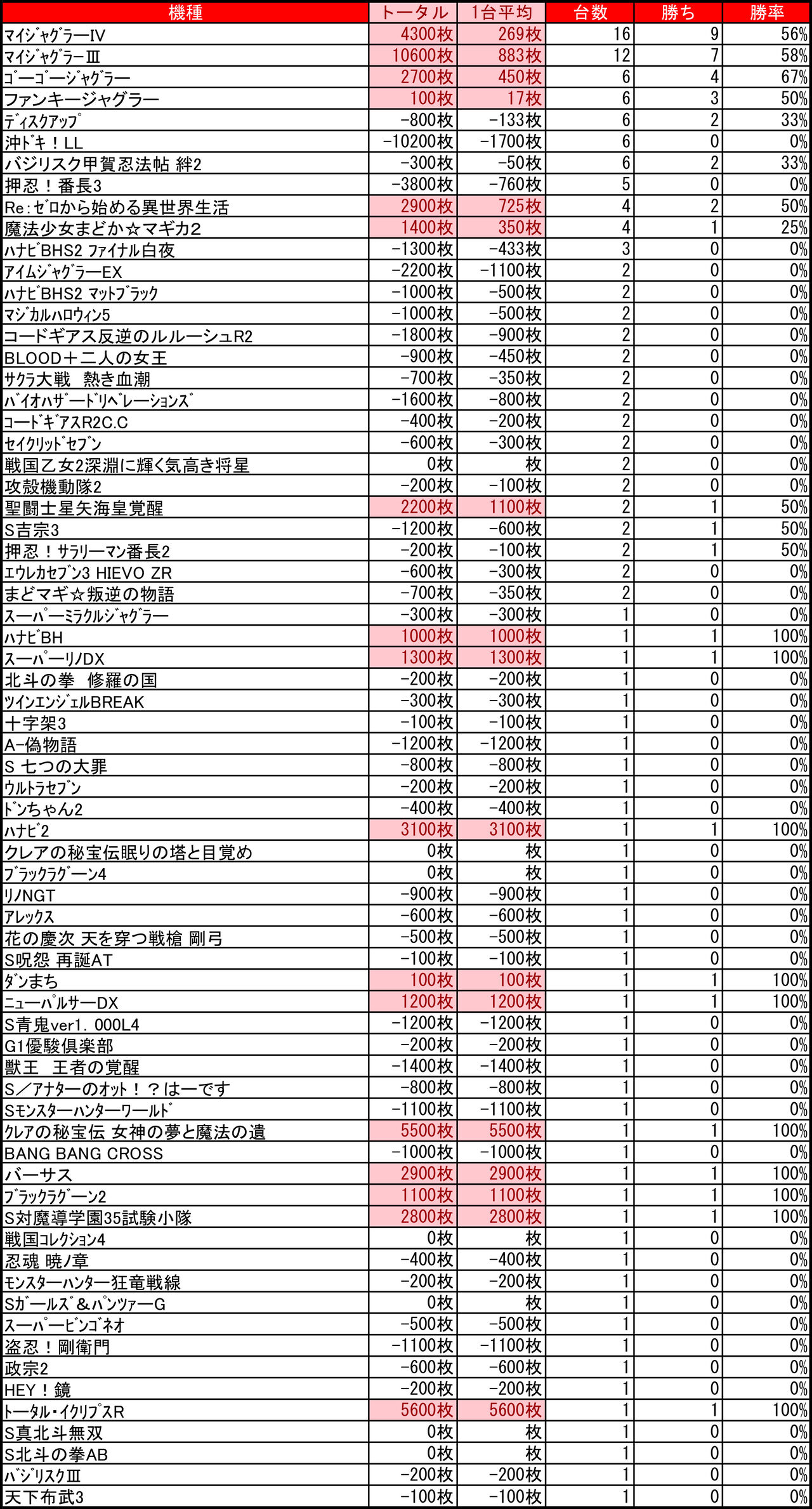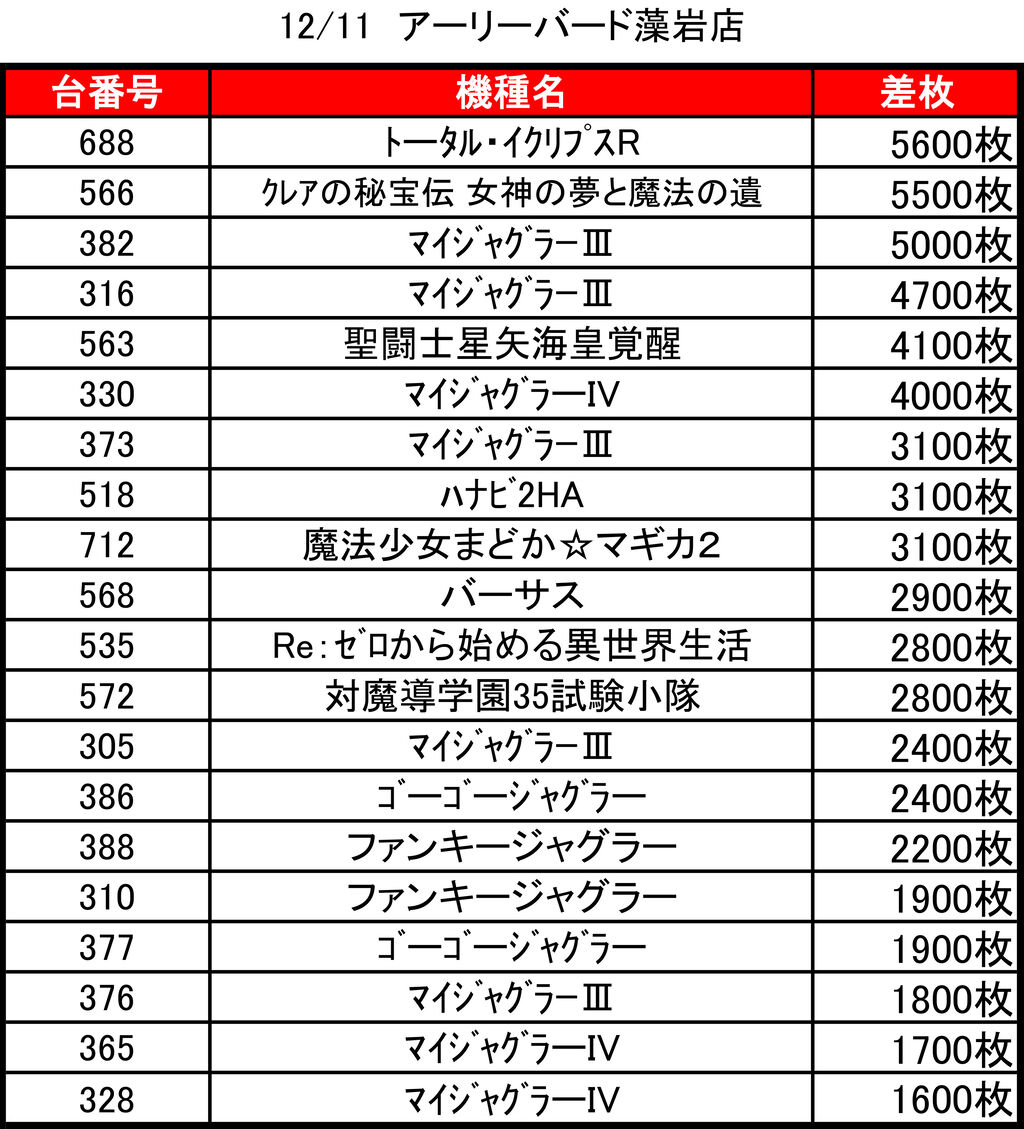 2020年12月14日 【12/11アーリーバード藻岩店】1の付く日→集計結果 1の付く日はアーリーバード藻岩店!ということで集計していきたいと思います。↓ちなみに前回↓【10/31アーリーバード藻岩店】1の付く日→集計結果では、早速。集計結果全体差枚:+4700枚1台平均:+32枚(20スロ:148台)全台勝率→43/148で29パーでした。 「特日」カテゴリの最新記事