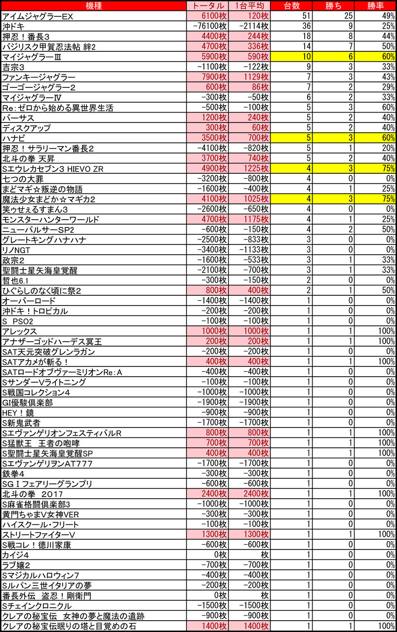 2021年01月11日 【1/10ひまわり月寒店】0の付く日→集計結果 0の付く日はひまわりの旧イベ日という事で「ひまわり月寒店」の集計を行っていきます。ちなみに↓前回↓【12/20ひまわり月寒店】0の付く日→集計結果集計結果全体差枚:-55200枚1台平均:-208枚(20スロ265台)全台勝率→100/265で38パーでした! 「特日」カテゴリの最新記事