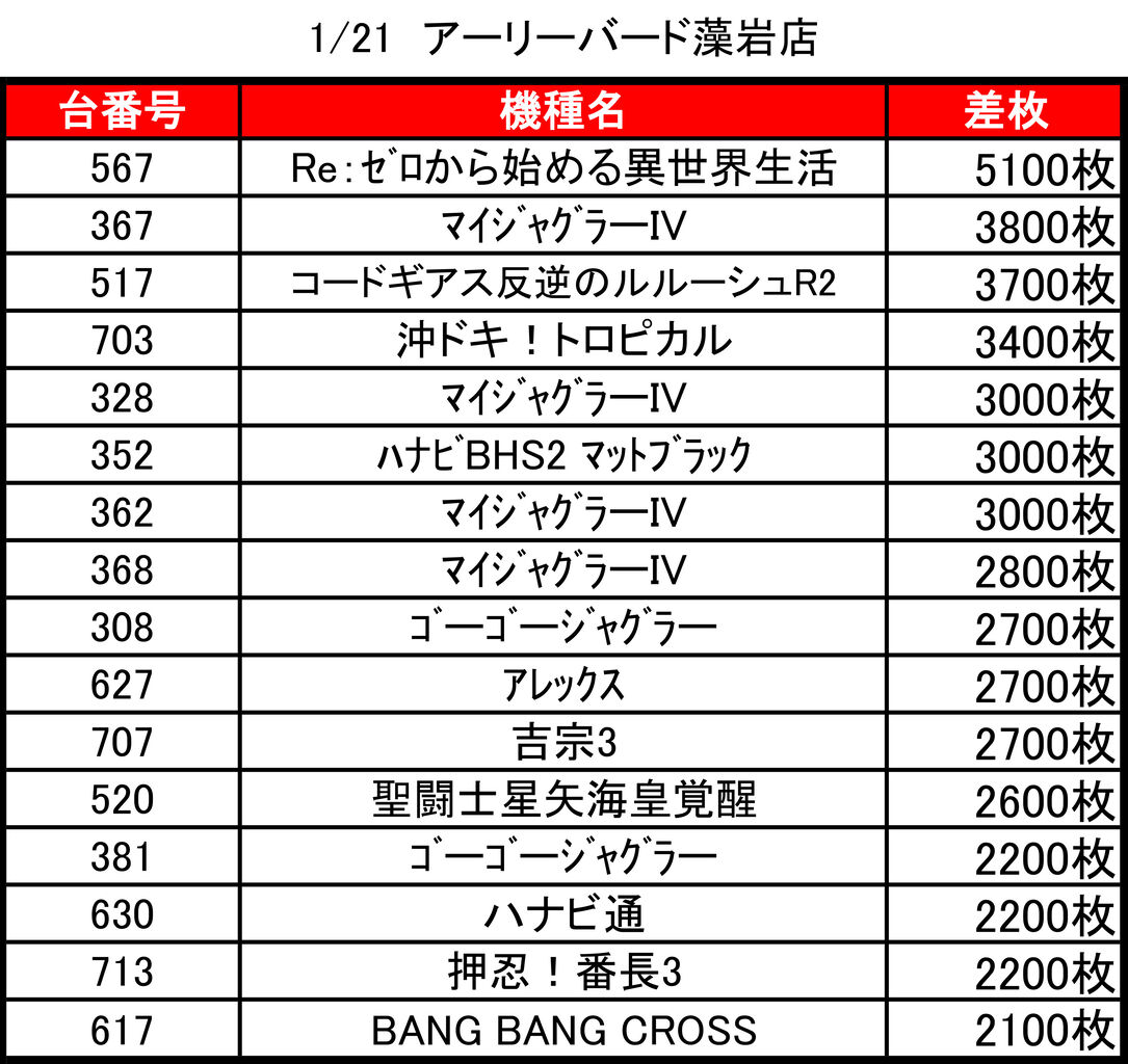 2021年01月22日 【1/21アーリーバード藻岩店】1の付く日→集計結果 1の付く日はアーリーバード藻岩店!ということで集計していきたいと思います。↓ちなみに前回↓【1/1アーリーバード藻岩店】1の付く日→集計結果では、早速。集計結果全体差枚:+31300枚1台平均:+210枚(20スロ:149台)全台勝率→58/149で39パーでした。 「特日」カテゴリの最新記事