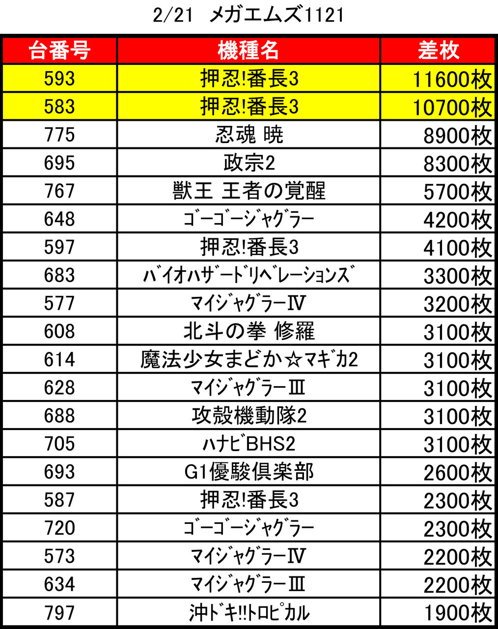 2021年02月22日 月イチ!!【2/21・メガエムズ1121】21日はッ!→集計結果 21日!ということでメガエムズ1121の集計を行います!↓ちなみに↓月イチ!!【1/21・メガエムズ1121】21日はッ!→集計結果全体差枚:-12400枚1台平均:-48枚(20スロ:260台)全台勝率→81/260で31パーでした。 「特日」カテゴリの最新記事