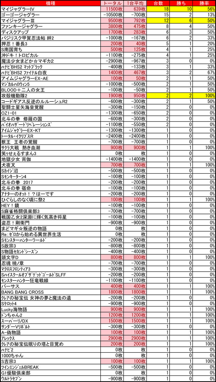 2021年05月14日 【5/11アーリーバード藻岩店】1の付く日→集計結果 1の付く日はアーリーバード藻岩店!ということで集計していきたいと思います。↓ちなみに前回↓【3/31アーリーバード藻岩店】1の付く日→集計結果では、早速。集計結果全体差枚:+5600枚1台平均:+38枚(20スロ:149台)全台勝率→52/149で35パーでした。 「特日」カテゴリの最新記事