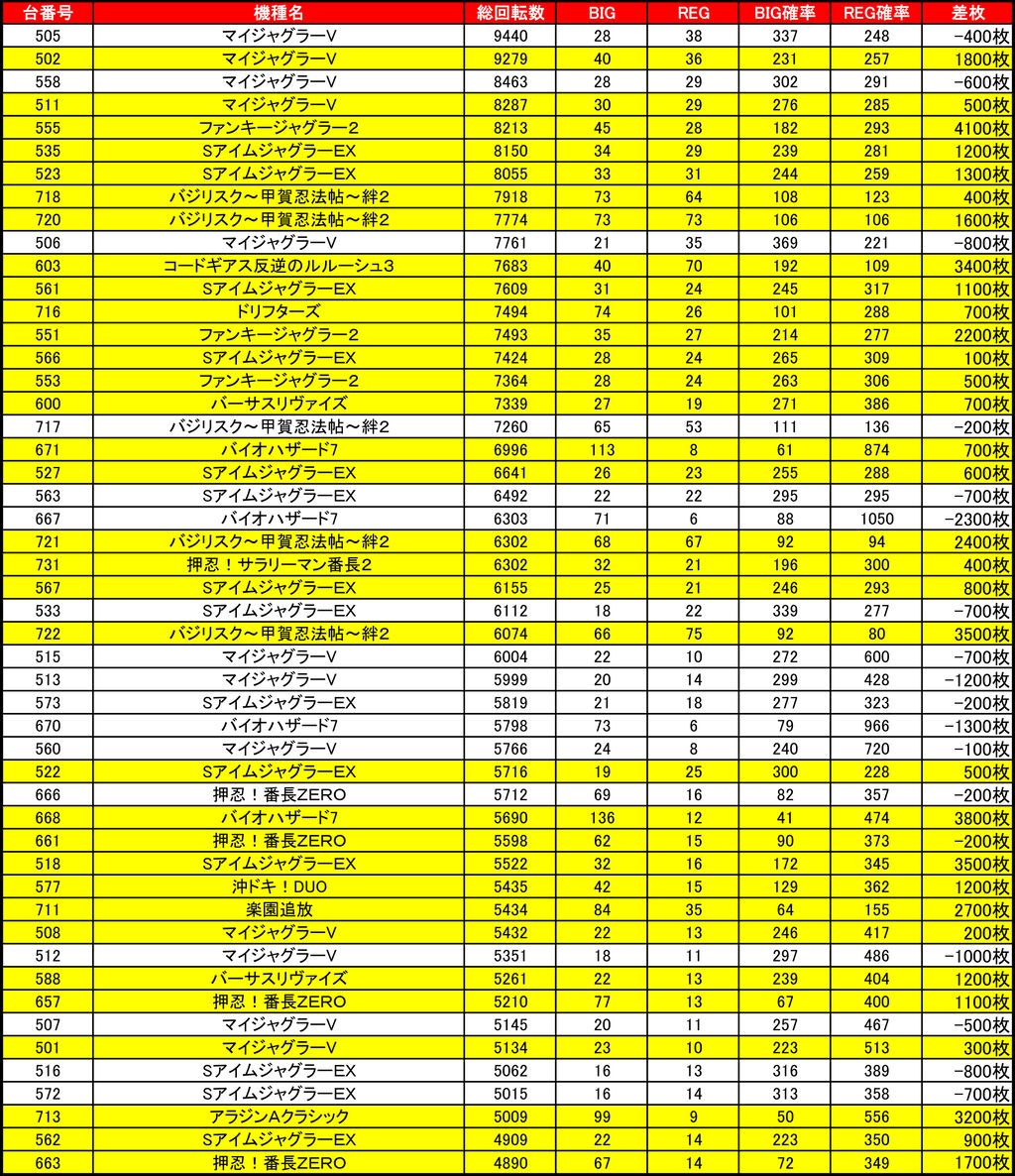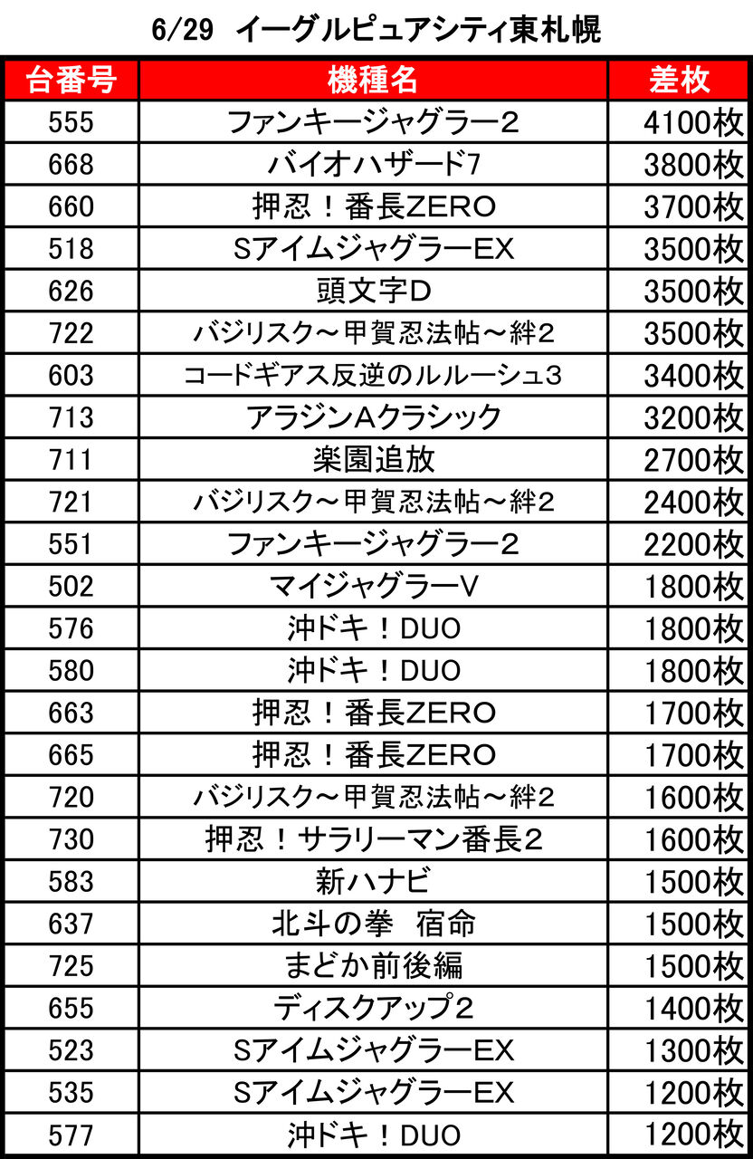 2022年06月30日 【6/29 イーグルピュアシティ東札幌店】9の付く日→集計結果 -スポンサーサイト-↓前回↓【6/19イーグルピュアシティ東札幌店】9の付く日→集計結果集計結果全体差枚:+10500枚1台平均:+69枚(20スロ:153台)全体勝率→57/153で37パーでしたっ! 「特日」カテゴリの最新記事