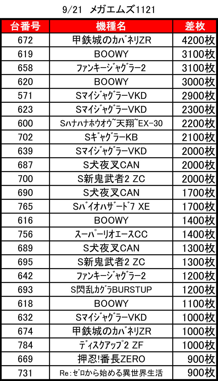 2022年09月23日 月イチ!!【9/21 メガエムズ1121】21日はッ!→集計結果 21日!ということでメガエムズ1121の集計を行います!↓ちなみに↓月イチ!!【7/21・メガエムズ1121】21日はッ!→集計結果全体差枚:-45600枚1台平均:-163枚(20スロ:280台)全台勝率→66/280で24パーでした。 「特日」カテゴリの最新記事
