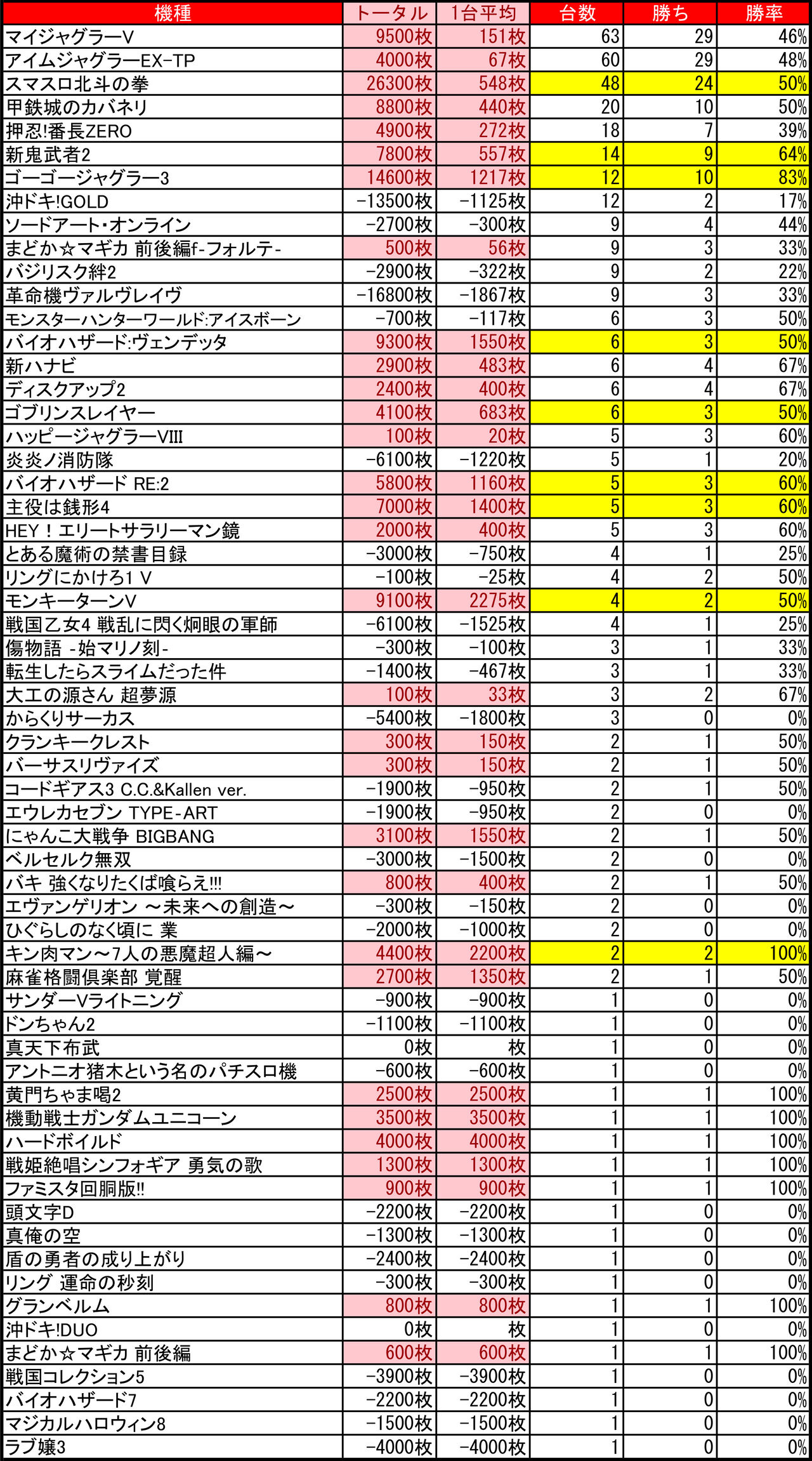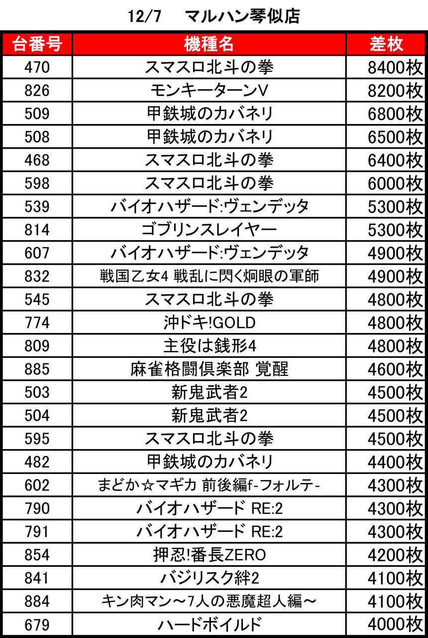 2023年12月18日 【12/17 マルハン琴似店】7の付く日→集計結果 -スポンサーサイト-集計結果全体差枚:+55900枚1台平均:+137枚(20スロ:408台) 全台勝率→187/408で46パーでした!-スポンサーサイト- 「特日」カテゴリの最新記事 タグ :#札幌#パチンコ#パチスロ#スロット#北海道