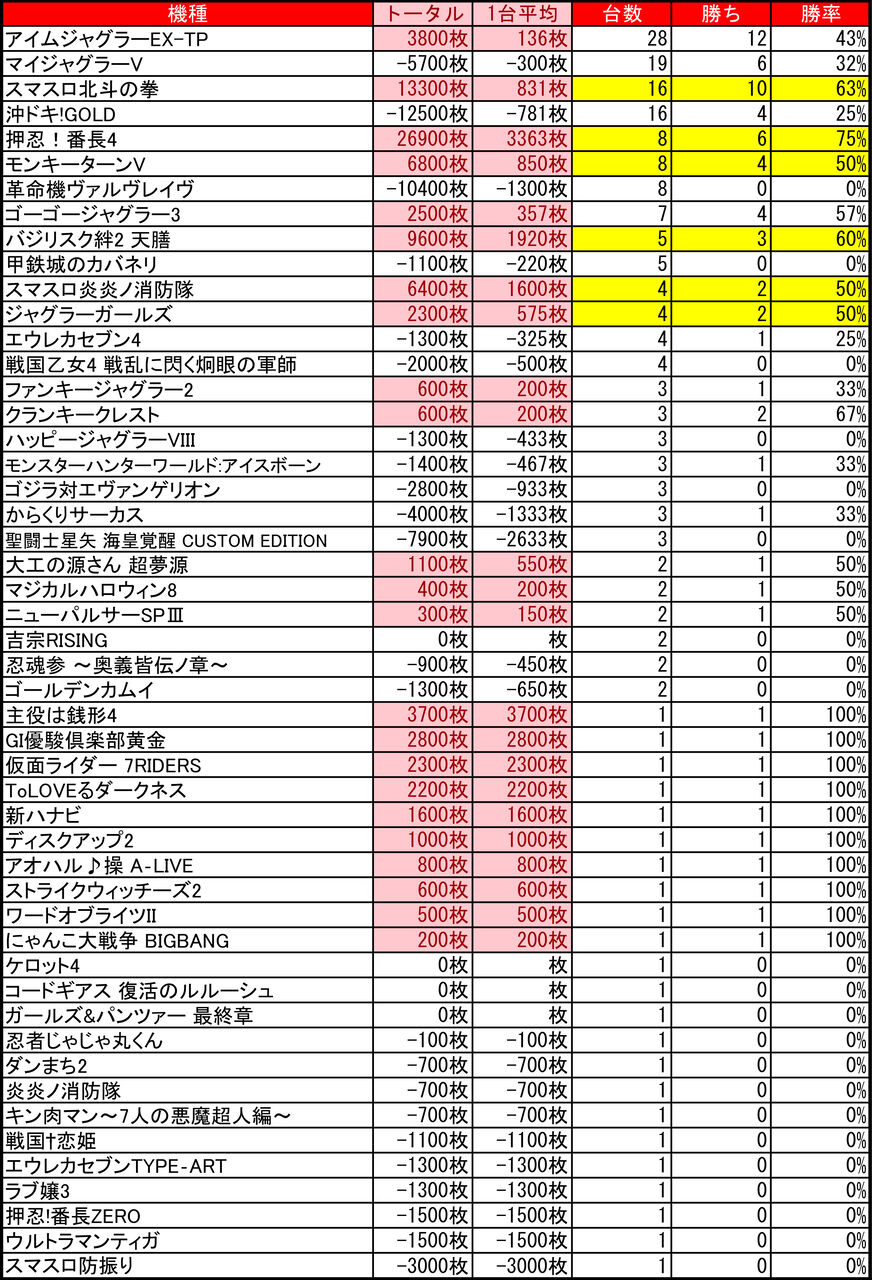 2024年06月20日 【6/19 イーグルウイング伏古店】9の付く日→集計結果 -スポンサーサイト-9のつく日はイーグル!ということで早速集計していきましょう!集計結果全体差枚:+25800枚1台平均:+134枚(20スロ:192台)全体勝率→73/192で38パーでしたっ!-スポンサーサイト- 「特日」カテゴリの最新記事 タグ :#patinko#スロット#札幌#パチンコ#パチスロ#特定日