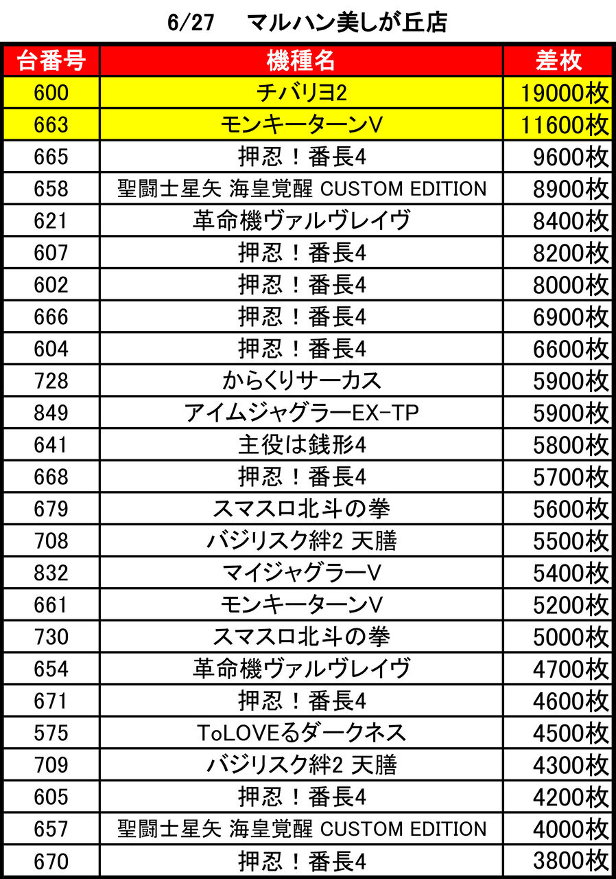 2024年06月28日 【6/27 マルハン美しが丘店】7の付く日→集計結果 -スポンサーサイト-【6/7 マルハン美しが丘店】7の付く日→集計結果集計結果全体差枚:+148800枚1台平均:+348枚(20スロ:428台)全台勝率→207/428で48パーでしたっ。-スポンサーサイト- 「特日」カテゴリの最新記事 タグ :#パチスロ#パチンコ#スロット#特定日#スマスロ