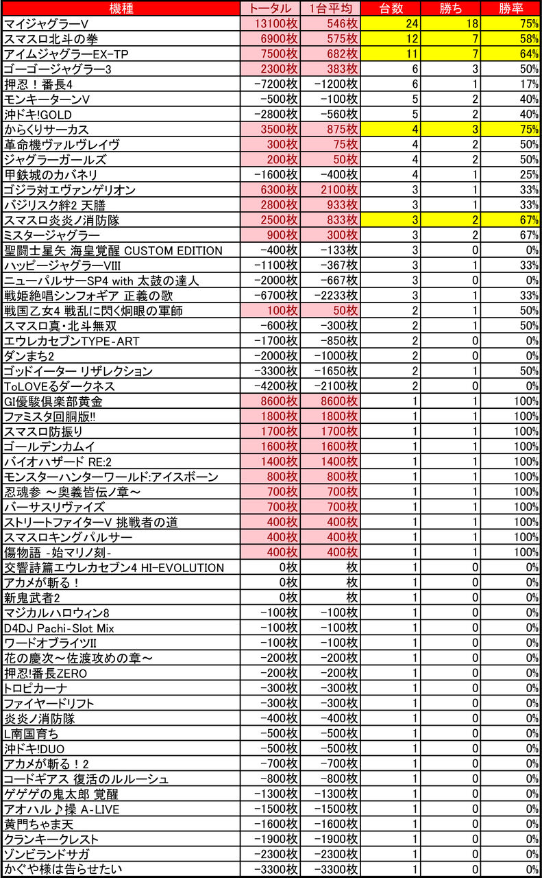 2024年09月23日 【9/21 アーリーバード藻岩店】1の付く日→集計結果 -スポンサーサイト-1の付く日はアーリーバード藻岩店!ということで集計していきたいと思います。集計結果全体差枚:+14700枚1台平均:+96枚(20スロ:153台)全台勝率→70/153で46パーでした。-スポンサーサイト- 「特日」カテゴリの最新記事 タグ :#特定日#特日#札幌#北海道#パチンコ#パチスロ#スロット
