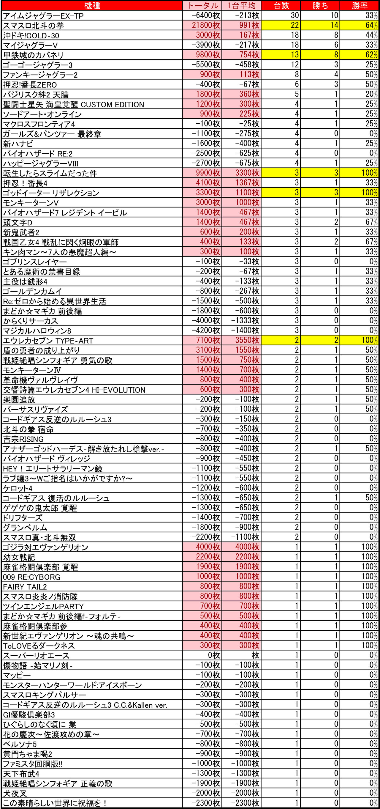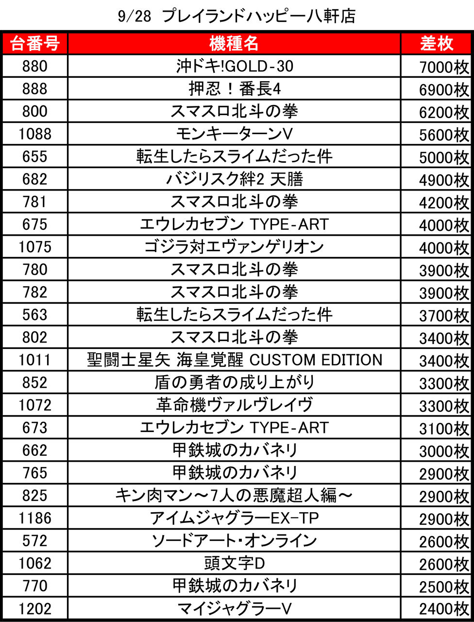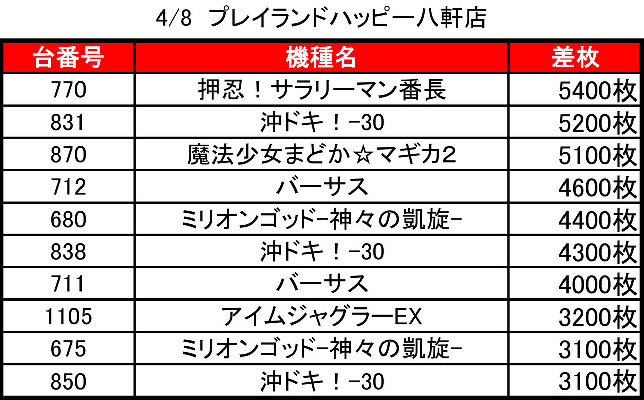 2024年09月30日 【9/28 プレイランドハッピー八軒店】8の付く日→集計結果 -スポンサーサイト-8の付く日の集計を行います。集計結果全体差枚:+26000枚1台平均:+92枚(20スロ:280台)全台勝率→107/280で38パーでした。-スポンサーサイト--スポンサーサイト- 「特日」カテゴリの最新記事 タグ :#札幌#パチンコ#スロット#パチスロ#北海道