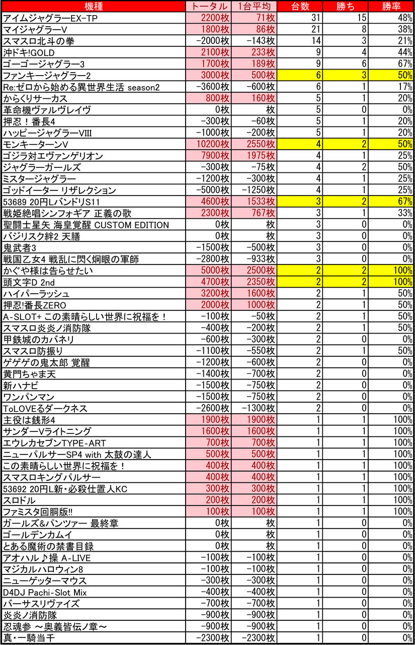 2024年11月10日 【11/8 ライジング元町店 】8のつく日→集計結果 -スポンサーサイト-↓前回↓【10/28 ライジング元町 】8のつく日→集計結果集計結果全体差枚:+23800枚1台平均:+119枚(20スロ200台)全体勝率→73/200で37パーでした。-スポンサーサイト--スポンサーサイト- 「特日」カテゴリの最新記事 タグ :#パチスロ#パチンコ#スロット#特定日#札幌#北海道