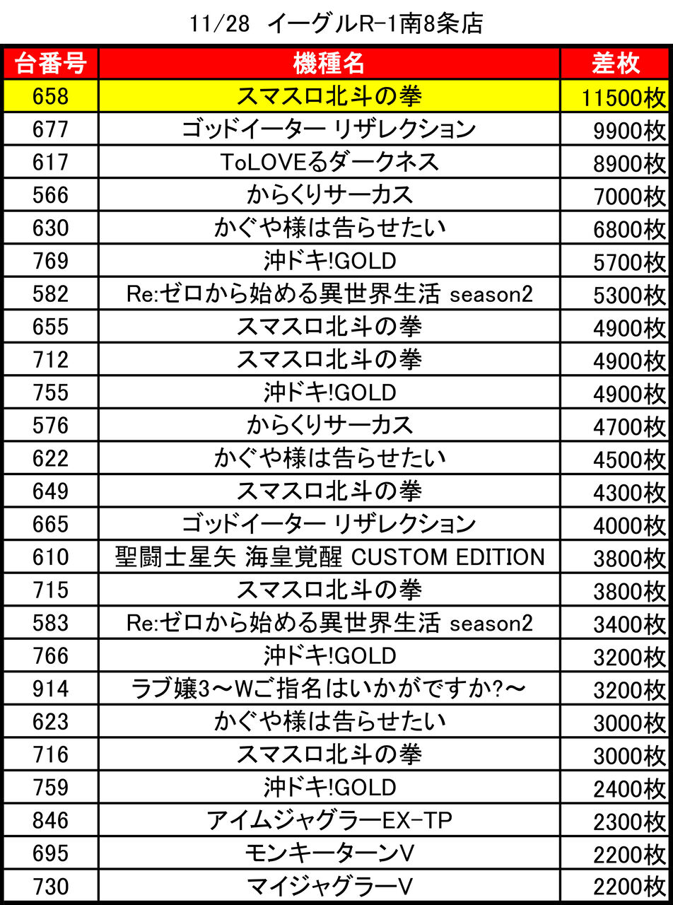 2024年11月30日 【11/28 イーグルR-1南8条店】時差11:00オープン→集計結果 -スポンサーサイト-集計結果全体差枚:-45900枚1台平均:-104枚(20スロ440台)勝率全体→133/440で30パーでしたっ!-スポンサーサイト- 「時差開店」カテゴリの最新記事 タグ :#パチンコ#パチスロ#スロット#札幌#ゾロ目の日
