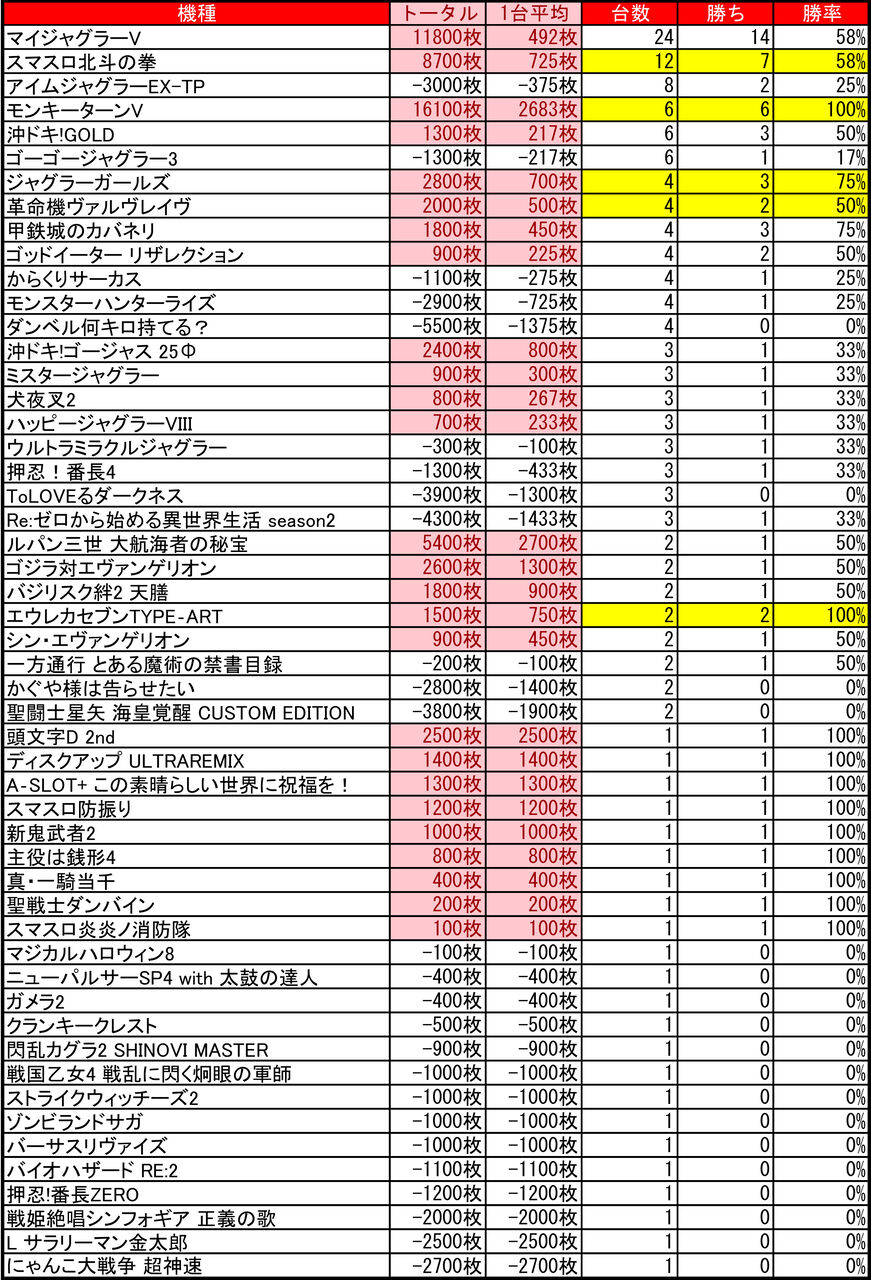 2025年02月04日 【1/31 アーリーバード藻岩店】1の付く日→集計結果 -スポンサーサイト-1の付く日はアーリーバード藻岩店!ということで集計していきたいと思います。集計結果全体差枚:+25100枚1台平均:+164枚(20スロ:153台)全台勝率→68/153で44パーでした。-スポンサーサイト- 「特日」カテゴリの最新記事 タグ :#特定日#特日#札幌#北海道#パチンコ#パチスロ#スロット