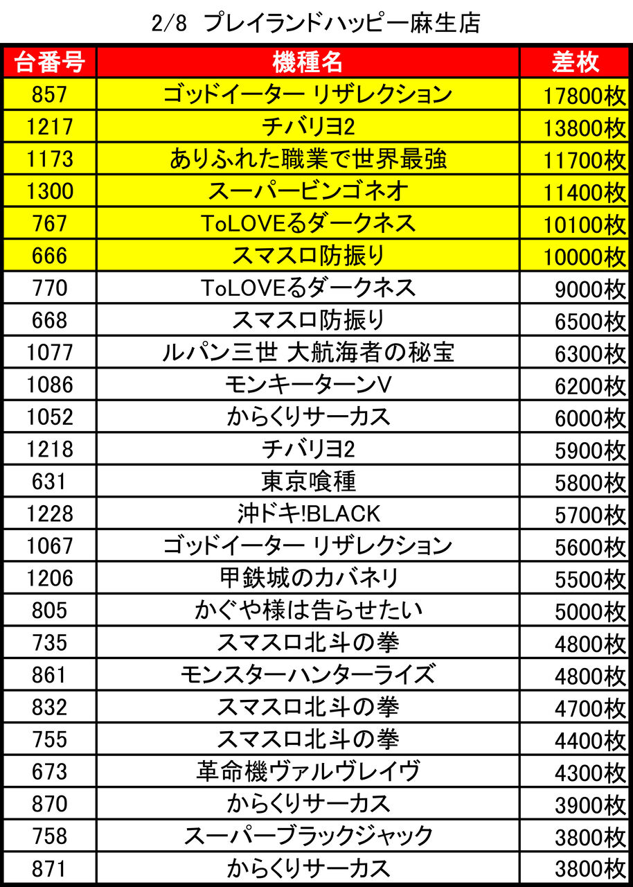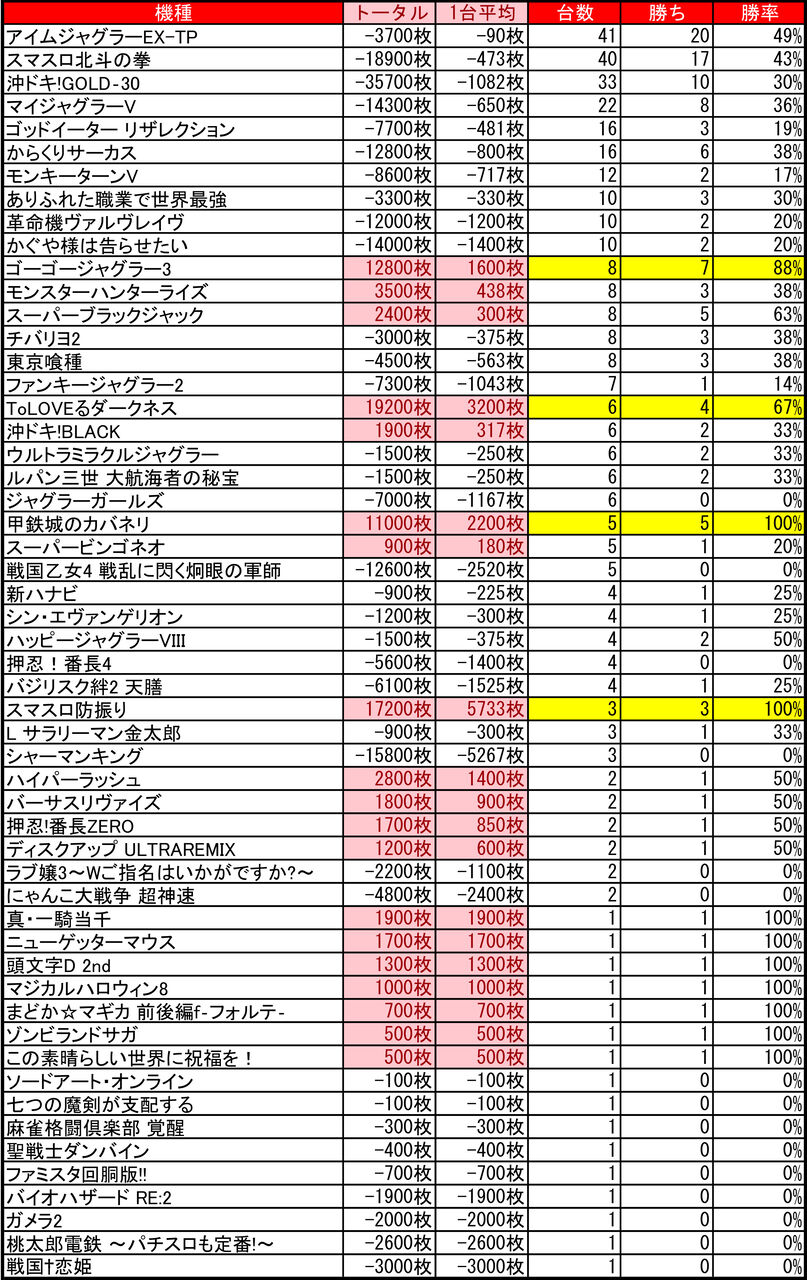 2025年02月10日 【2/8 プレイランドハッピー麻生店】8の付く日→集計結果 -スポンサーサイト-8の付く日はハッピーの特日!ということでプレイランドハッピー麻生店!ちなみに・・・↓前回↓【1/28 プレイランドハッピー麻生店】8の付く日→集計結果集計結果全体差枚:-134500枚1台平均:-374枚(20スロ:359台)全体勝率→132/359で37パーでした。-スポンサーサイト- 「特日」カテゴリの最新記事 タグ :#札幌#北海道#パチンコ#パチスロ#スロット#特日#特定日