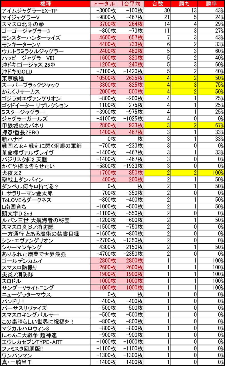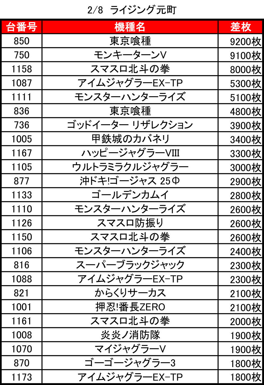 2025年02月10日 【2/8 ライジング元町店 】8のつく日→集計結果 -スポンサーサイト-↓前回↓【1/28 ライジング元町 】8のつく日→集計結果集計結果全体差枚:-18900枚1台平均:-94枚(20スロ200台)全体勝率→69/200で35パーでした。-スポンサーサイト--スポンサーサイト- 「特日」カテゴリの最新記事 タグ :#パチスロ#パチンコ#スロット#特定日#札幌#北海道
