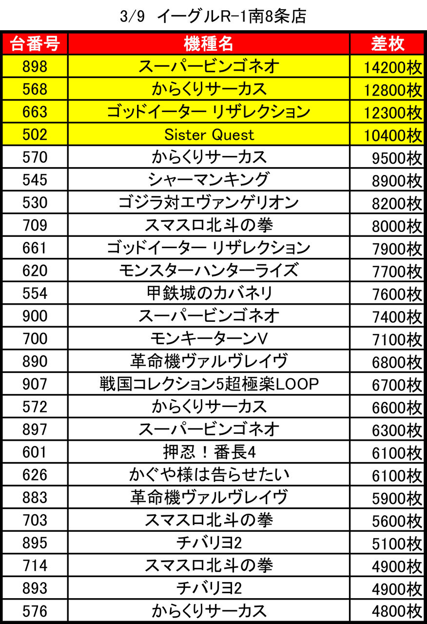 2025年03月12日 【3/9 イーグルR-1南8条店】9のつく日→集計結果 -スポンサーサイト-集計結果全体差枚:-18200枚1台平均:-41枚(20スロ441台)勝率全体→178/441で40パーでしたっ!-スポンサーサイト- 「特日」カテゴリの最新記事 タグ :#パチンコ#パチスロ#スロット#札幌#特定日