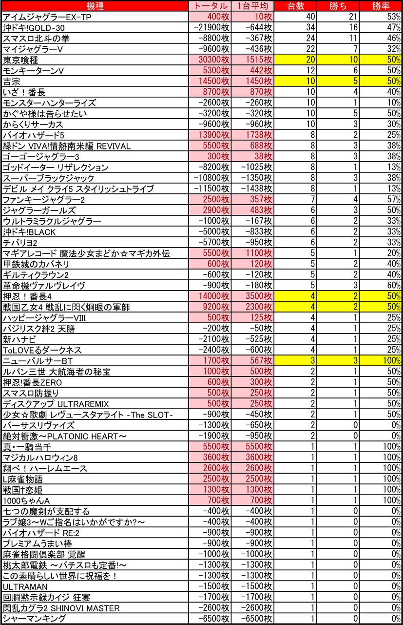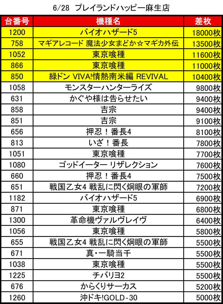 2025年07月01日 【6/28 プレイランドハッピー麻生店】8の付く日→集計結果 -スポンサーサイト-8の付く日はハッピーの特日!ということでプレイランドハッピー麻生店!集計結果全体差枚:+7900枚1台平均:+22枚(20スロ:359台)-スポンサーサイト-全体勝率→147/359で41パーでした。-スポンサーサイト- 「特日」カテゴリの最新記事 タグ :#札幌#北海道#パチンコ#パチスロ#スロット#特日#特定日