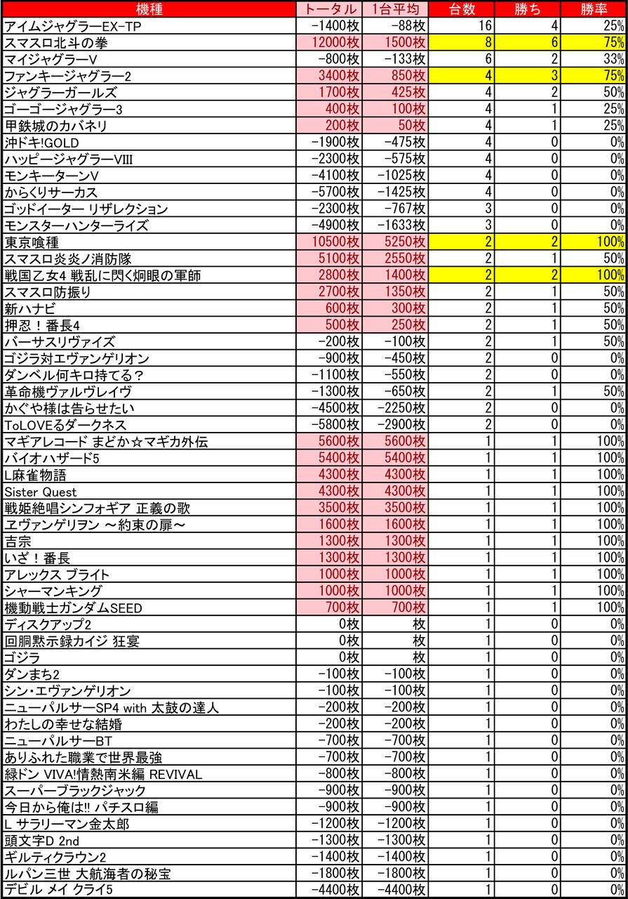 2025年07月22日 【7/20 ひまわりファイターズ通り店】0の付く日→集計結果 -スポンサーサイト-集計結果全体差枚:+18000枚1台平均:+150枚(20スロ:120台)-スポンサーサイト-全台勝率→41/120で34パーでした。-スポンサーサイト- 「特日」カテゴリの最新記事 タグ :#パチンコ#パチスロ#スロット#北海道#札幌