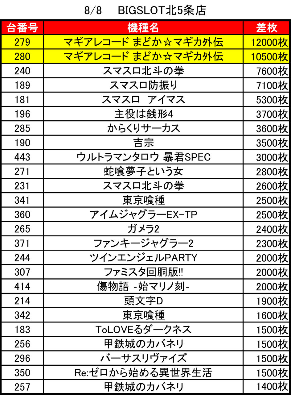 2025年08月11日 【8/8 ビッグスロット北5条店】ゾロ目の日→集計結果 -スポンサーサイト-集計結果全体差枚:+5200枚1台平均:+17枚(20スロ299台)-スポンサーサイト-スロ全体→79/299で26パーでしたっ!-スポンサーサイト- 「ゾロ目」カテゴリの最新記事