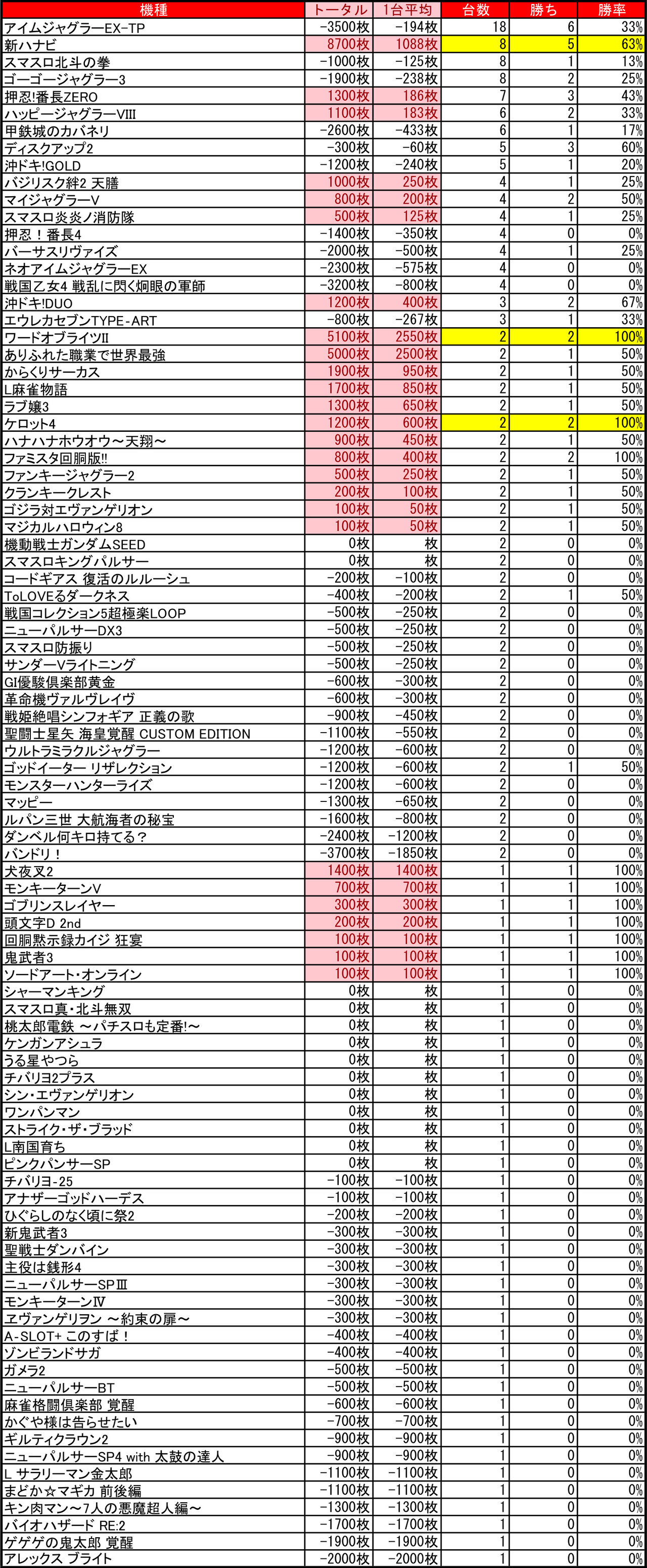 2025年11月17日 【11/15 ベガスベガス美しが丘】5の付く日→集計結果 -スポンサーサイト-5の付く日はベガスベガス!ということで、ベガスベガス美しが丘店の集計をしていきます。では早速!集計結果全体差枚:-18500枚1台平均:-89枚(20スロ208台)全体勝率→58/208で28%でした!-スポンサーサイト- 「特日」カテゴリの最新記事