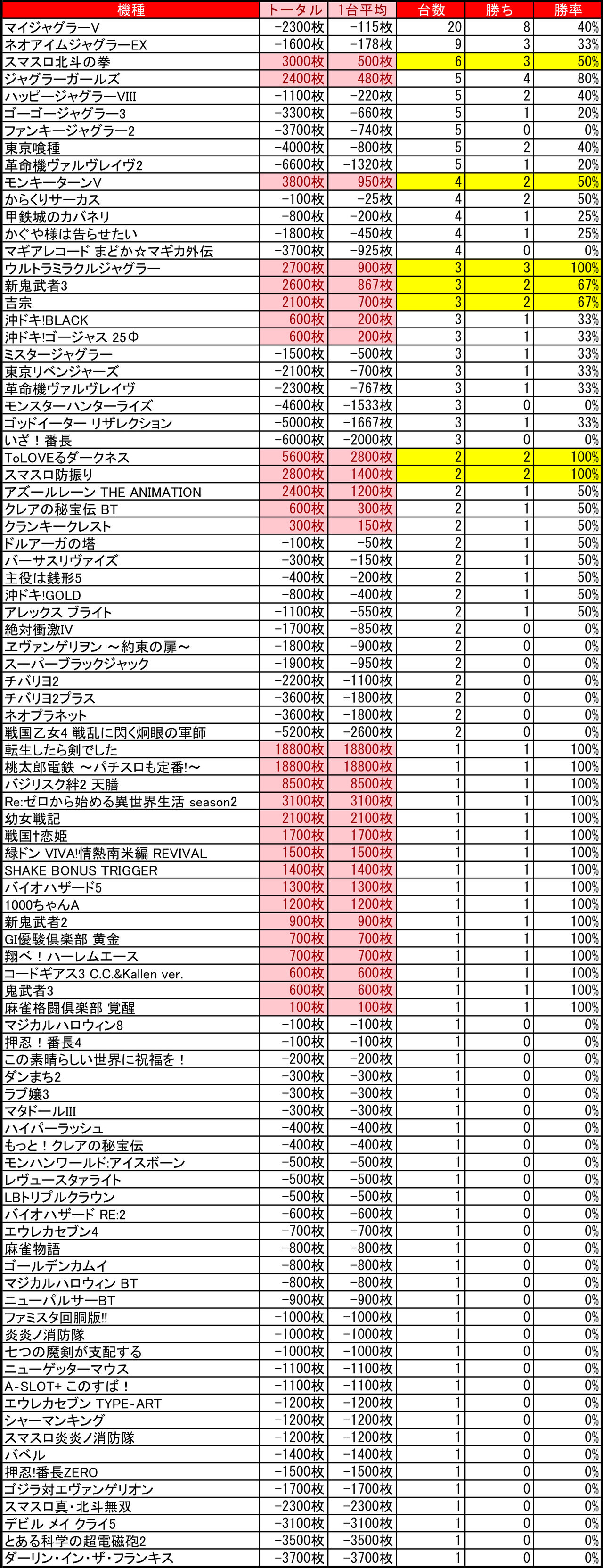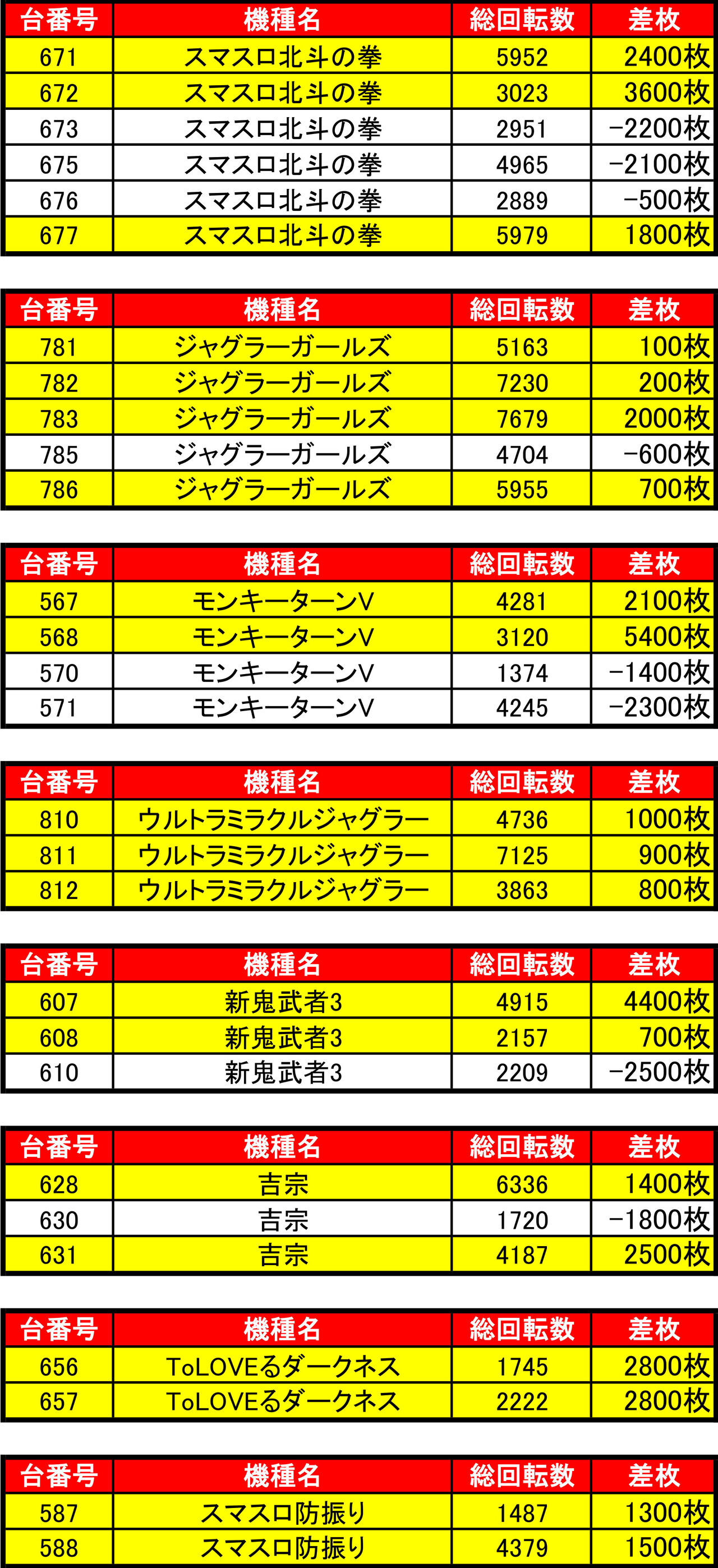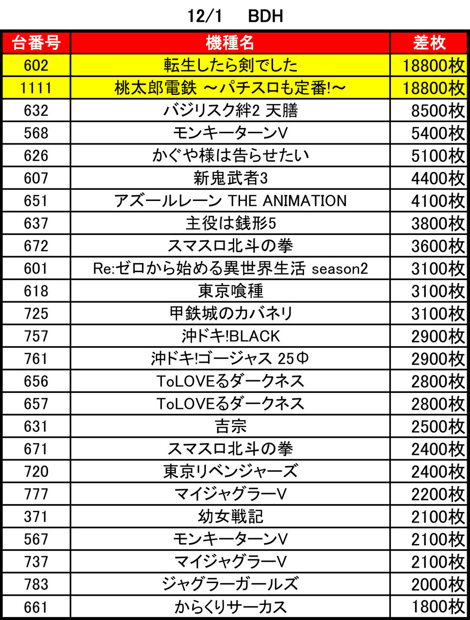 2025年12月02日 【12/1 ビッグ大王東店】1のつく日!→集計結果 集計結果全体差枚:-15900枚1台平均:-79枚(20スロ:200台)全台勝率→71/200で36パーでした。☆★☆★☆★☆★☆★☆★EBHは・・・? 「BIG大王東店(BDH)」カテゴリの最新記事 タグ :#BDH#EBH#スロット#パチンコ#特定日#時差オープン