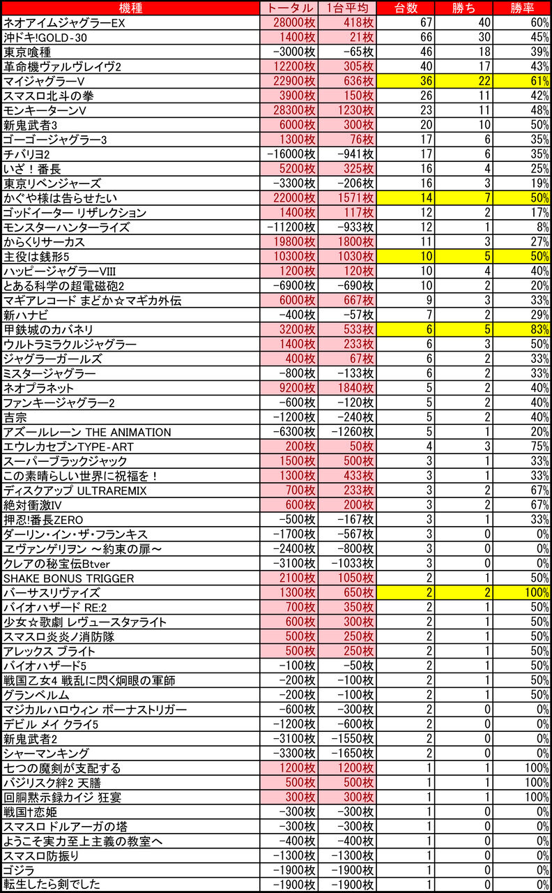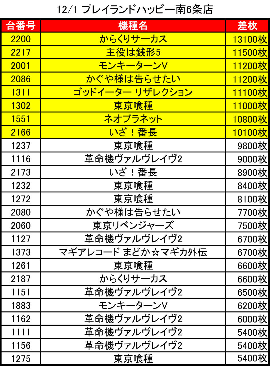2025年12月04日 【12/1 プレイランドハッピー南6条店】毎月1日は・・・?→集計結果 -スポンサーサイト-集計結果全体差枚:117600枚1台平均:+197枚(20スロ:597台)全体勝率→254/597で43パーでした。-スポンサーサイト- 「特日」カテゴリの最新記事