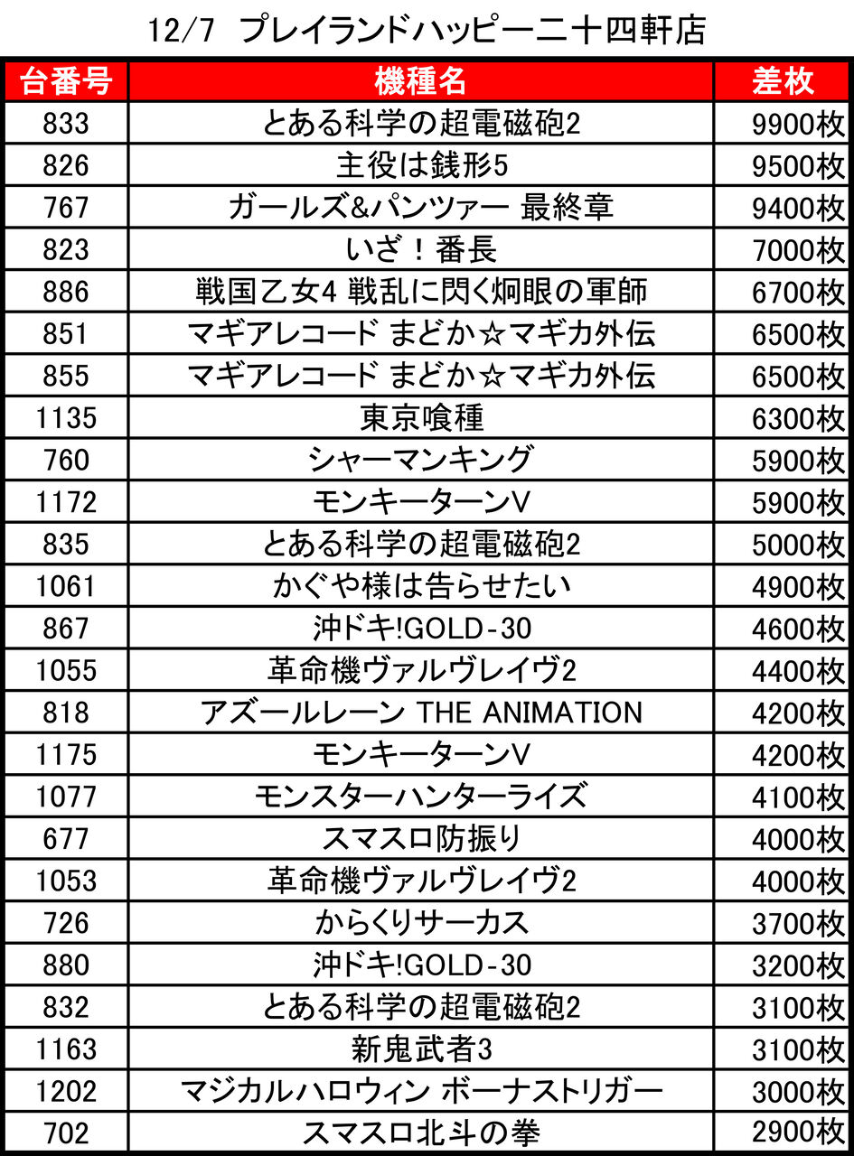 2025年12月09日 【12/7 プレイランドハッピー二十四軒店】時差10:00オープン!→集計結果 -スポンサーサイト-集計結果全体差枚:-79500枚1台平均:-251枚(20スロ:316台)全体勝率→105/316で33パーでした。-スポンサーサイト- 「時差開店」カテゴリの最新記事