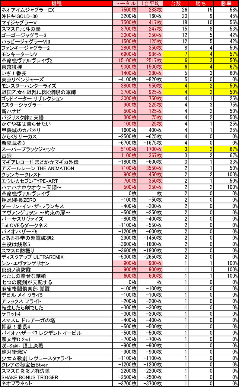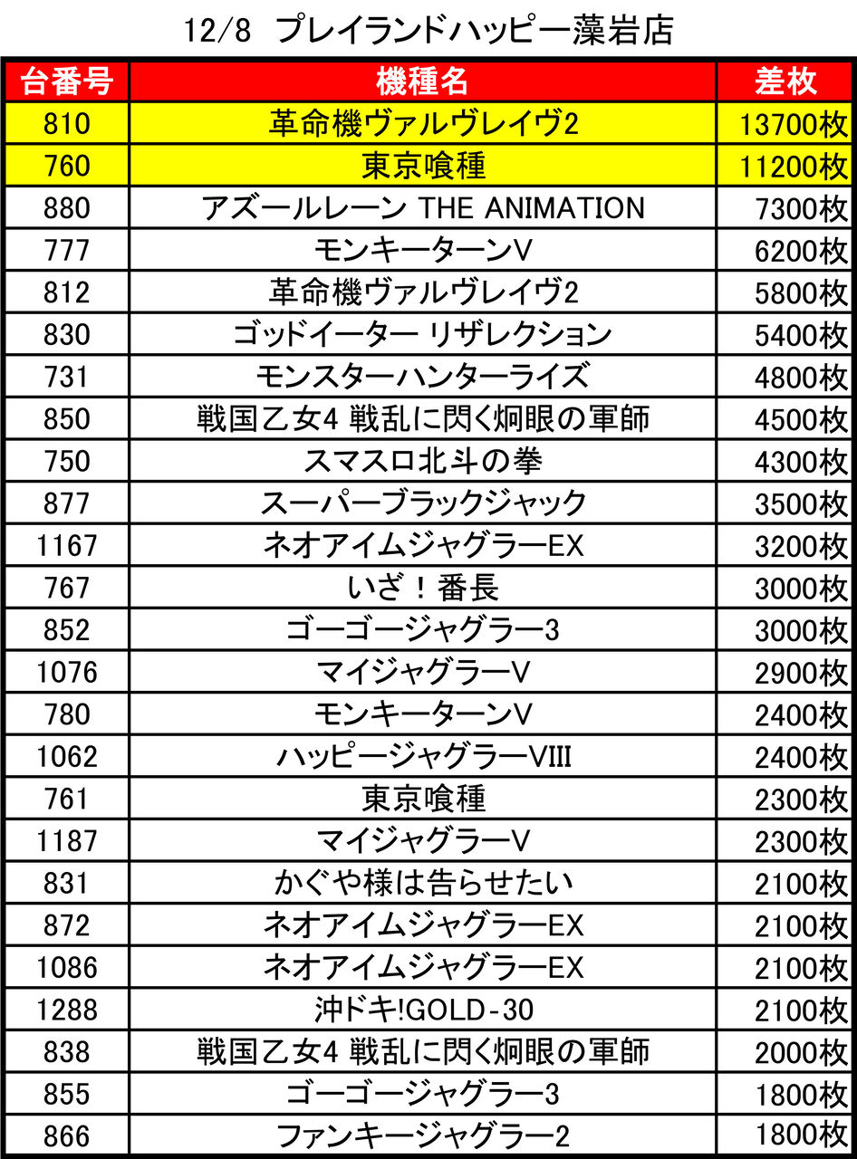 2025年12月09日 【12/8 プレイランドハッピー藻岩店】8のつく日!→集計結果 -スポンサーサイト-集計結果全体差枚:+33500枚1台平均:+140枚(20スロ:239台) 全台勝率→100/239で42パーでした。-スポンサーサイト- 「特日」カテゴリの最新記事