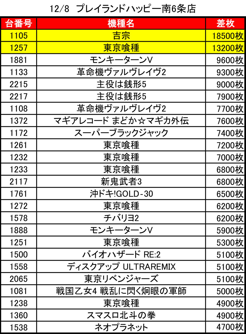 2025年12月09日 【12/8 プレイランドハッピー二十四軒店】8のつく日→集計結果 -スポンサーサイト-集計結果全体差枚:-64700枚1台平均:-204枚(20スロ:316台)全体勝率→110/316で35パーでした。-スポンサーサイト- 「特日」カテゴリの最新記事