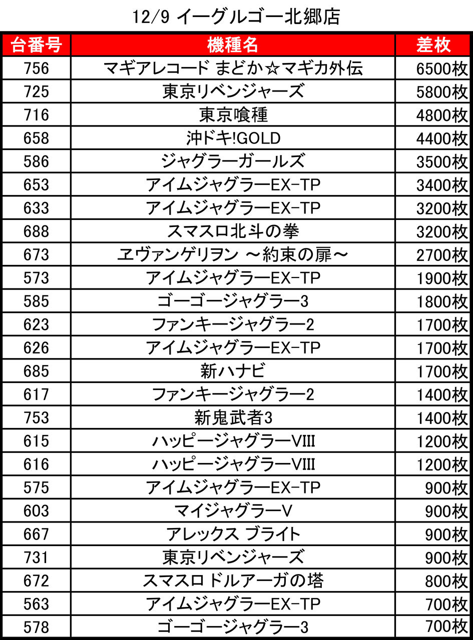 2025年12月10日 【12/9 イーグルゴー北郷店】9の付く日→集計結果 -スポンサーサイト-集計結果全体差枚:-8800枚1台平均:-68枚(20スロ129台)全体→48/129で37パーでしたっ!-スポンサーサイト--スポンサーサイト- 「特日」カテゴリの最新記事