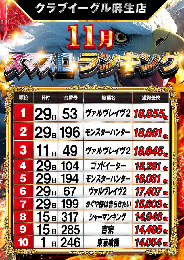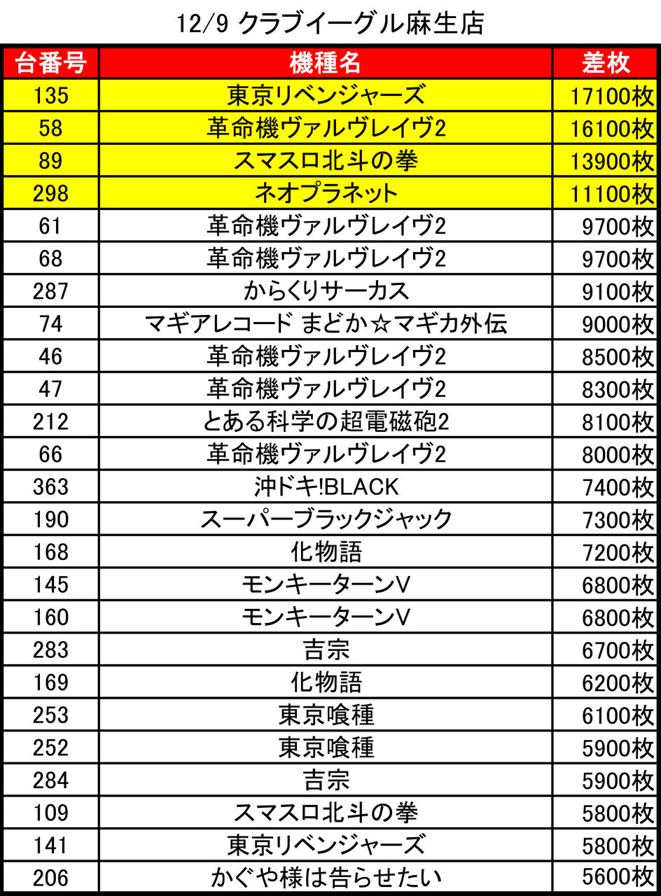 2025年12月10日 【12/9 クラブイーグル麻生店】9の付く日→集計結果 -スポンサーサイト-集計結果全体差枚:+123500枚1台平均:+292枚(20スロ:423台)全体勝率→178/423で42パーです!-スポンサーサイト- 「特日」カテゴリの最新記事