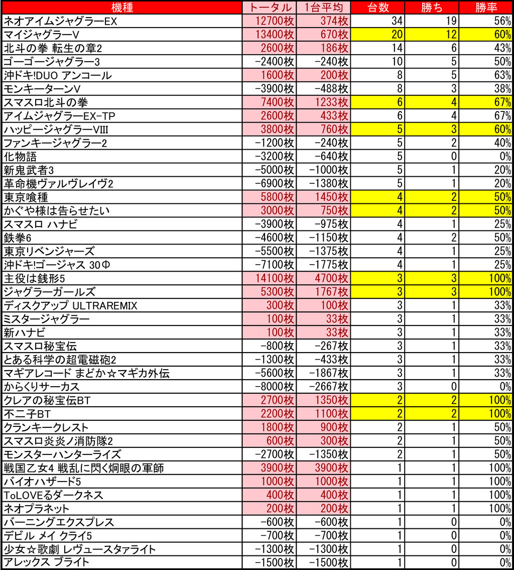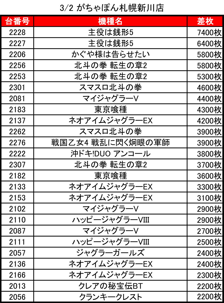 2026年03月03日 【3/2 がちゃぽん新川店】2の付く日→集計結果 -スポンサーサイト-2の付く日恒例の「がちゃぽん新川店」。さて早速集計に取り掛かります集計結果!全体差枚:+19400枚1台平均:+97枚(20スロ:200台)全台勝率→97/200で49パーでした-スポンサーサイト- 「特日」カテゴリの最新記事