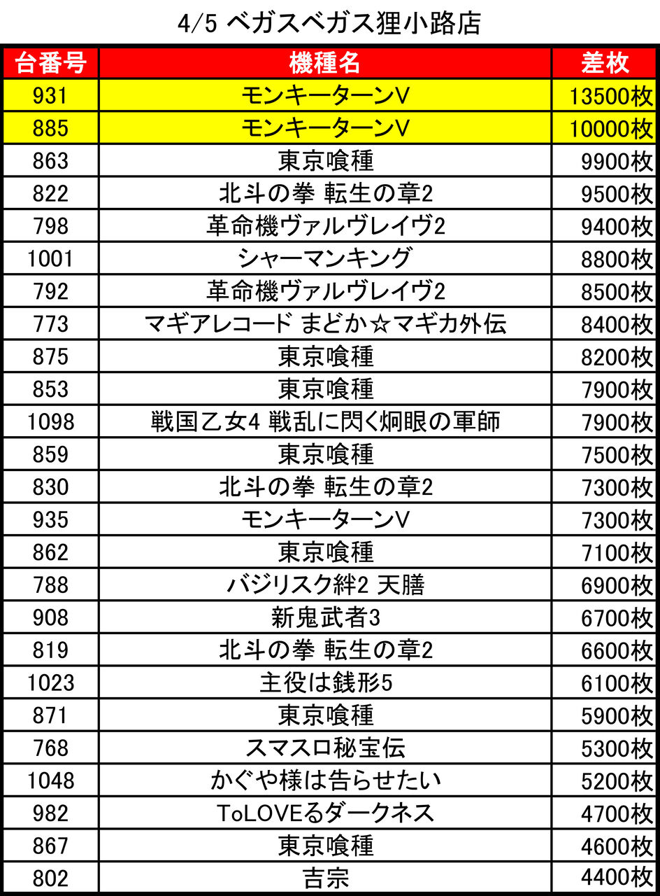 2026年04月06日 【4/5 ベガスベガス狸小路4丁目店】5の付く日→集計結果 -スポンサーサイト-集計結果全体差枚:-9100枚1台平均:-17枚(20スロ531台)全台勝率→213/531で40パーでした!-スポンサーサイト- 「特日」カテゴリの最新記事